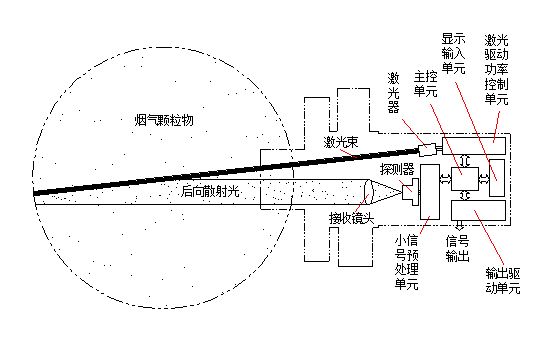 粉塵儀包括激光光源及功率控制單元、光電傳感與小信號(hào)預(yù)處理單元、散射光接收單元、顯示與輸入單元、輸出驅(qū)動(dòng)單元、主控單元。激光器發(fā)出的650nm束以一個(gè)微小的角度射入排放源,激光束與煙塵粒子作用產(chǎn)生散射光,背向散射光通過(guò)接受系統(tǒng)進(jìn)入傳感器轉(zhuǎn)變成電信號(hào)進(jìn)行處理。電路部分實(shí)現(xiàn)光電轉(zhuǎn)換、激光束的調(diào)制、信號(hào)放大、解調(diào)、光源的功率控制、V/I轉(zhuǎn)換功能。整個(gè)系統(tǒng)的構(gòu)成包括主機(jī)及校準(zhǔn)系統(tǒng)、吹掃系統(tǒng)、連接附件及防雨箱。